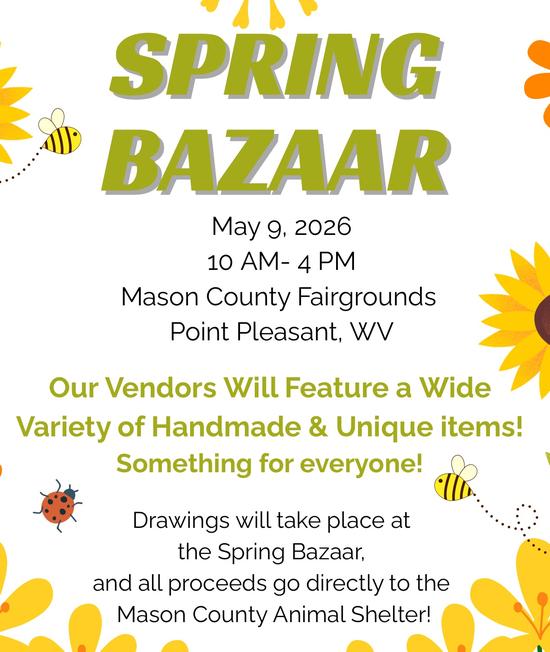 Mark your calendars for the Spring Bazaar May 9th that benefits the Mason County WV Animal Shelter.